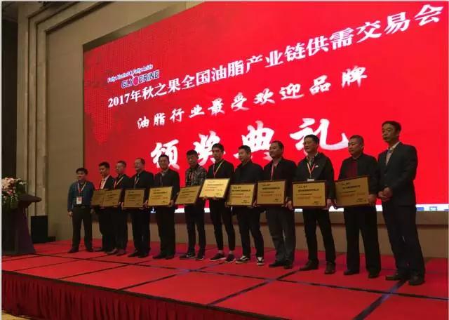 徐立庶總經(jīng)理作為頒獎嘉賓向獲得“油脂行業(yè)最受歡迎品牌”的企業(yè)頒獎